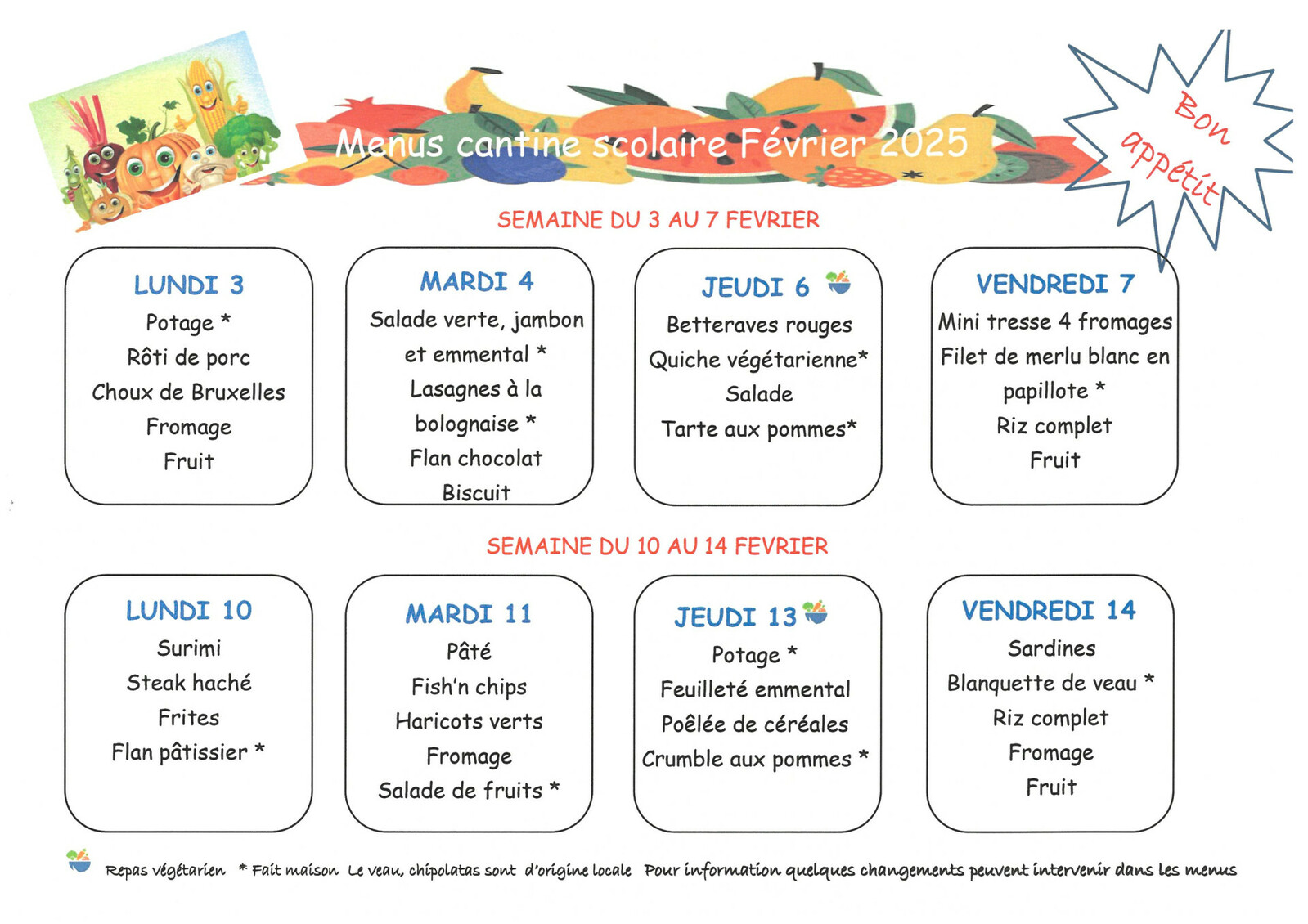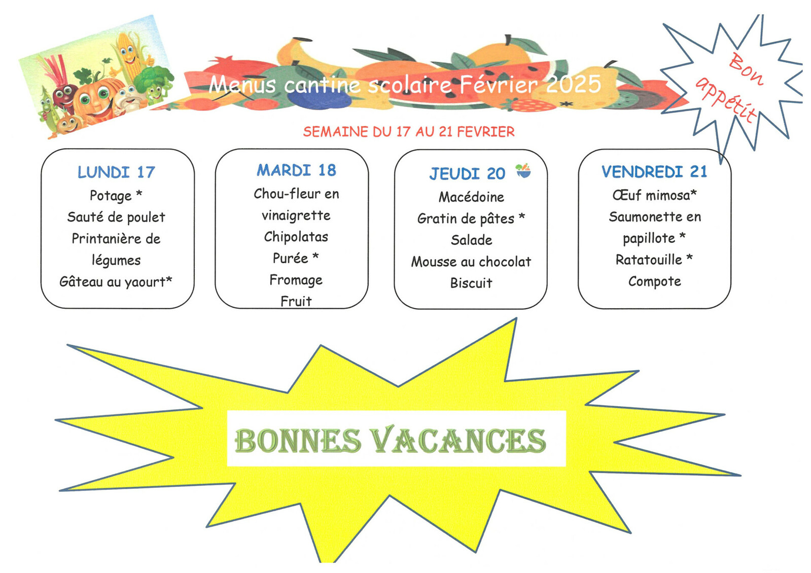 Cantine scolaire Menus du lundi 03 février au 21 février 2025